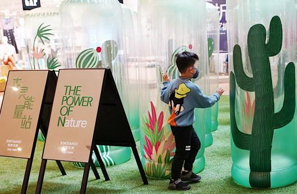 展览主展区用几十个特殊展陈装置,将植物、水、绿色等与自然相关的元素引入位于商业中心内部的活动空间,打造最接近自然的休闲空间。观众们可以漫步其中,近距离感受到自然的蓬勃生机,也可以在原木打造的休息区域驻足,品味嘈杂都市里难得的一缕清新。