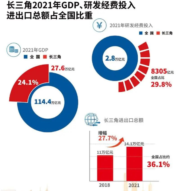 2021年长三角地区GDP在全国占比达到24.1%,研发经费投入在全国占比达到29.8%,进出口总额达到14.1万亿元,占到全国的36.1%,同比2018年增长了27.7%。