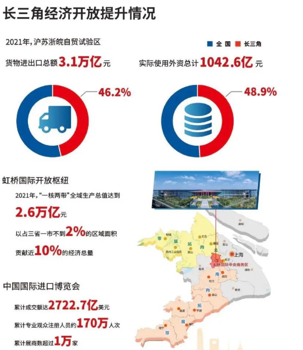 已经成功举办四届的中国国际进口博览会和虹桥国际开放枢纽的快速发展也彰显出长三角开放型经济体制的构建成果。
